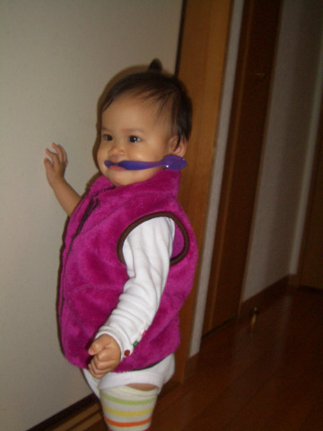 (堅持要咬著湯匙繞房間一圈,不肯還我@@)